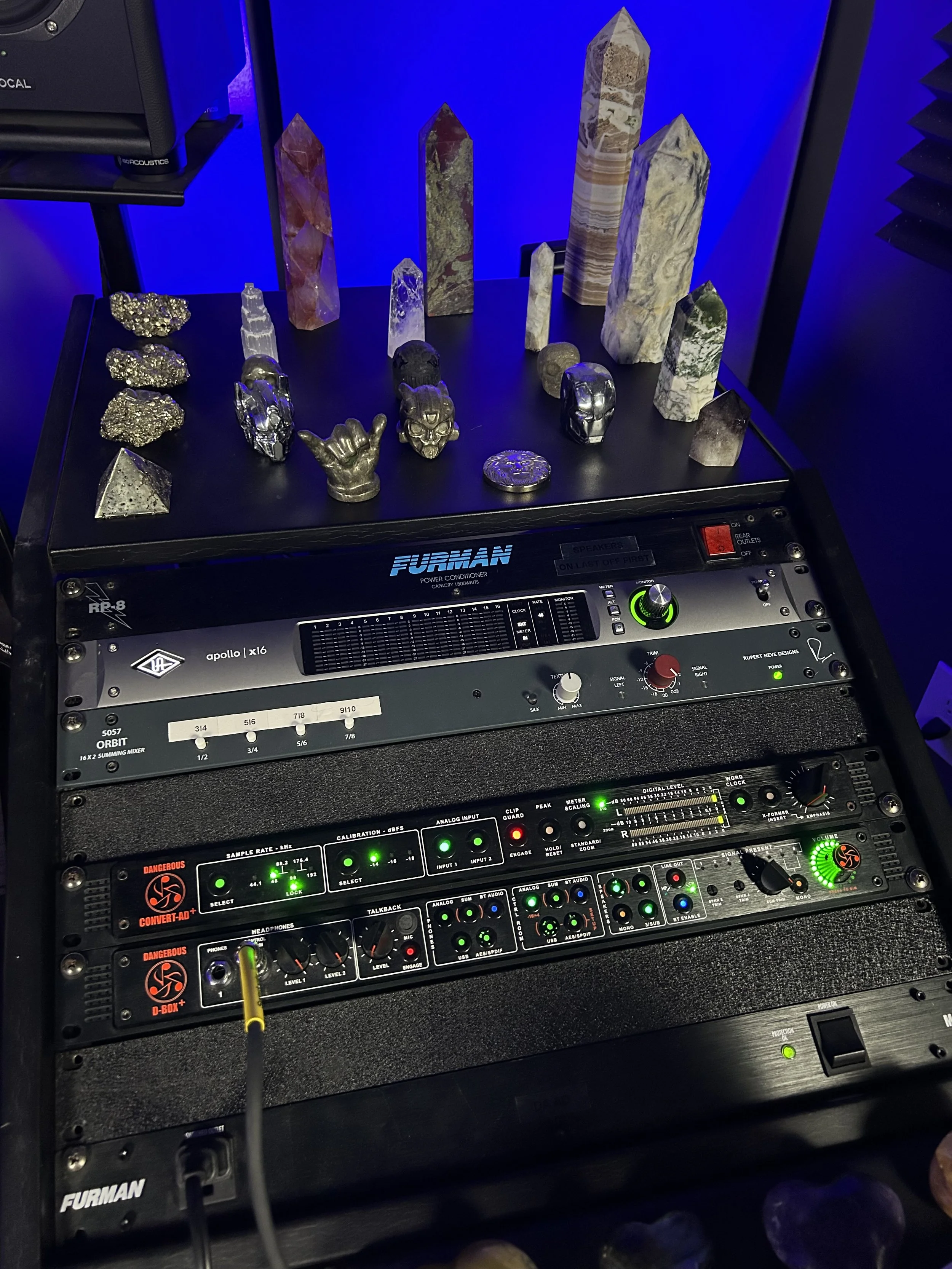 The RSP studio uses a mastering grade AD+ converter and D Box+ by Dangerous Music integrated with a Universal Audio Apollo X16. At mix down, we have the ability to sum 16 analog output channels through a Rupert Neve Designs Orbit summing box.